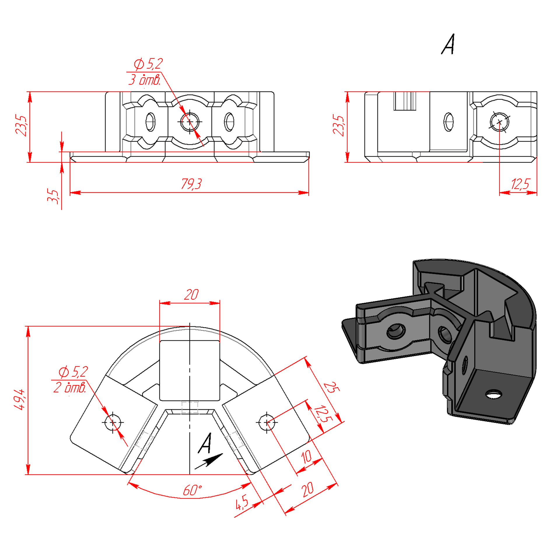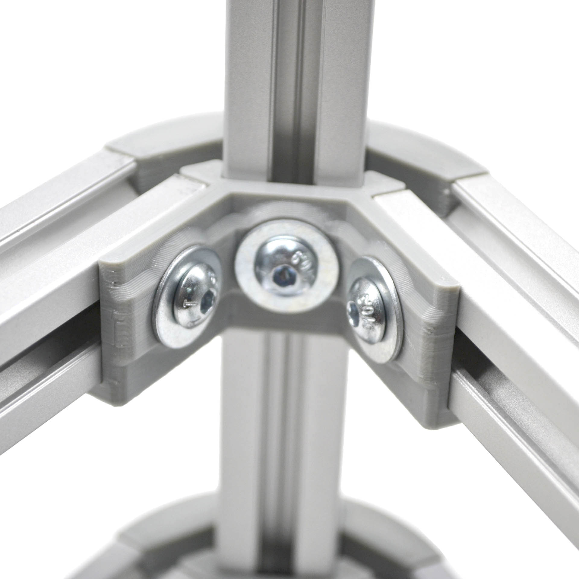 3-х сторонний внутренний угловой соединитель к профилям серии 20, с пазом 6 мм. Позволяет зафиксировать узлы конструкции под углом 60 градусов.