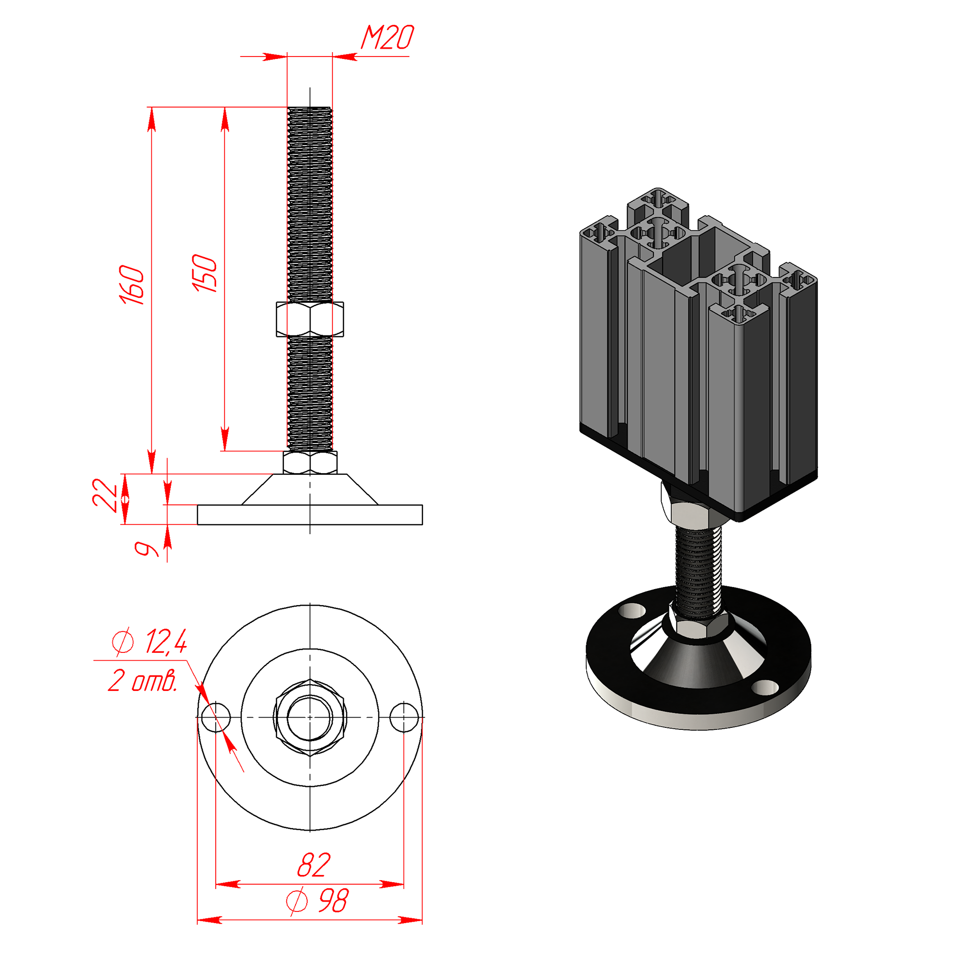 D75M12H100 | Опора регулируемая. Основание резина 75 мм. Шпилька М12х100 мм