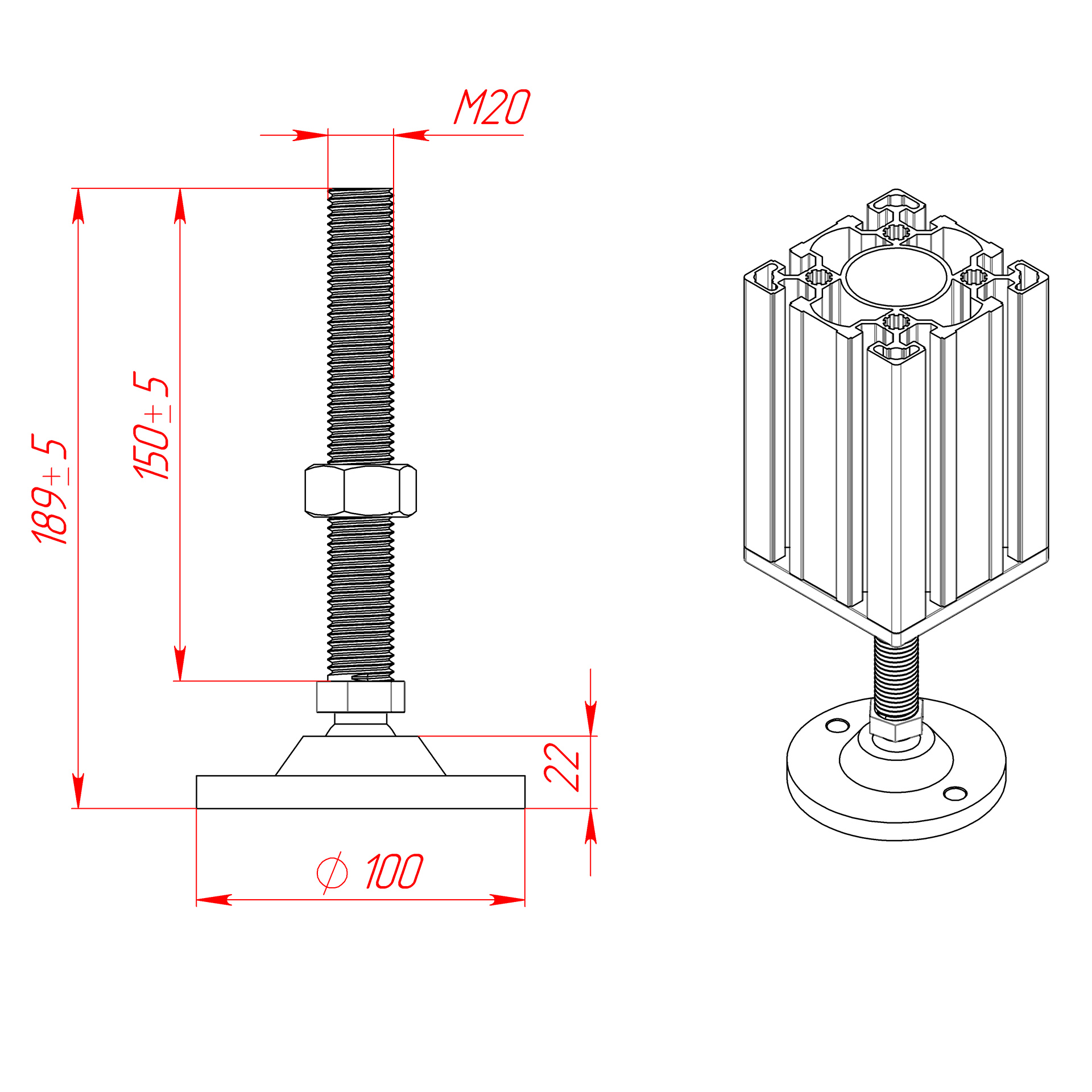 7933 | Опора наклонная нержавеющая. Основание 100 мм. Шпилька М20х150 мм.