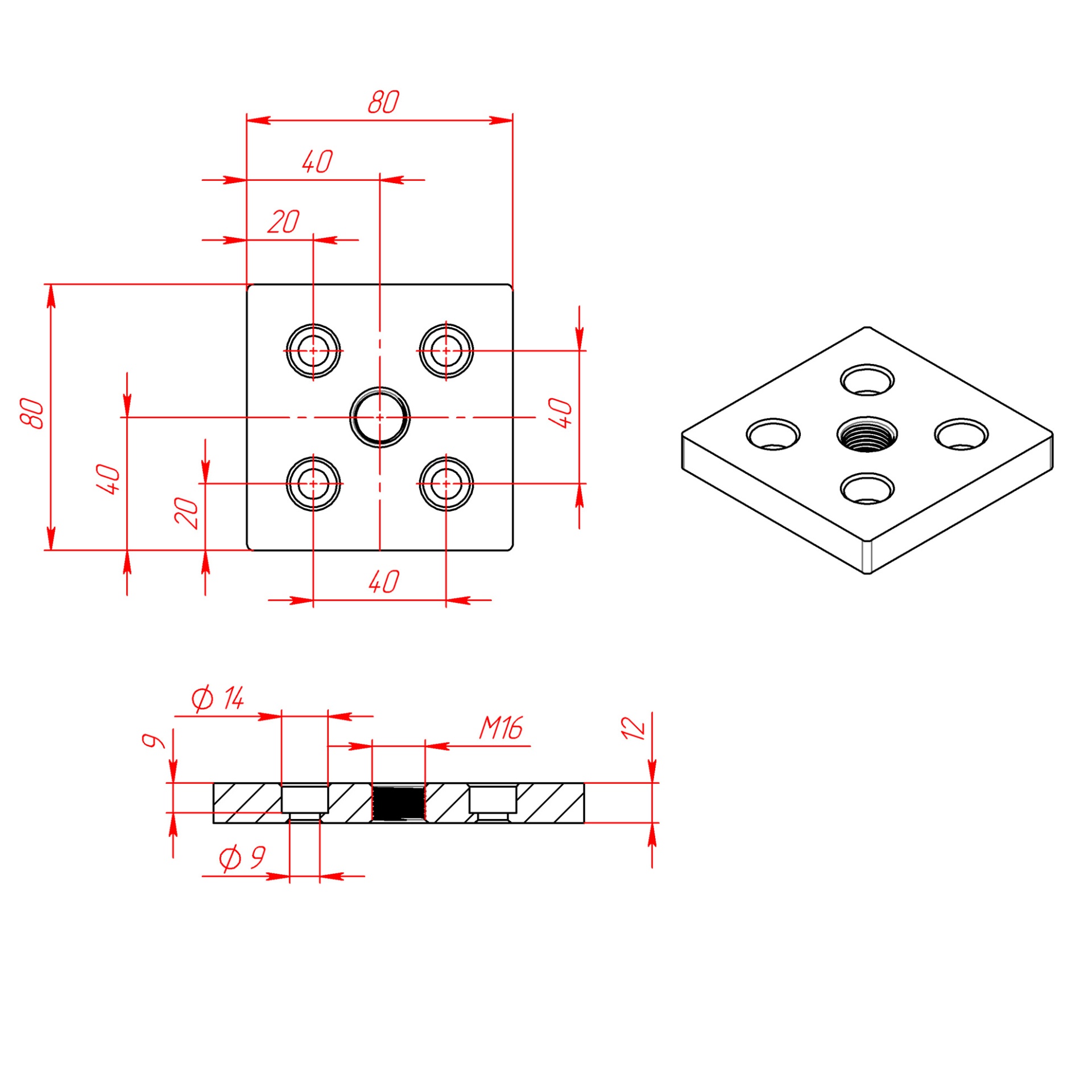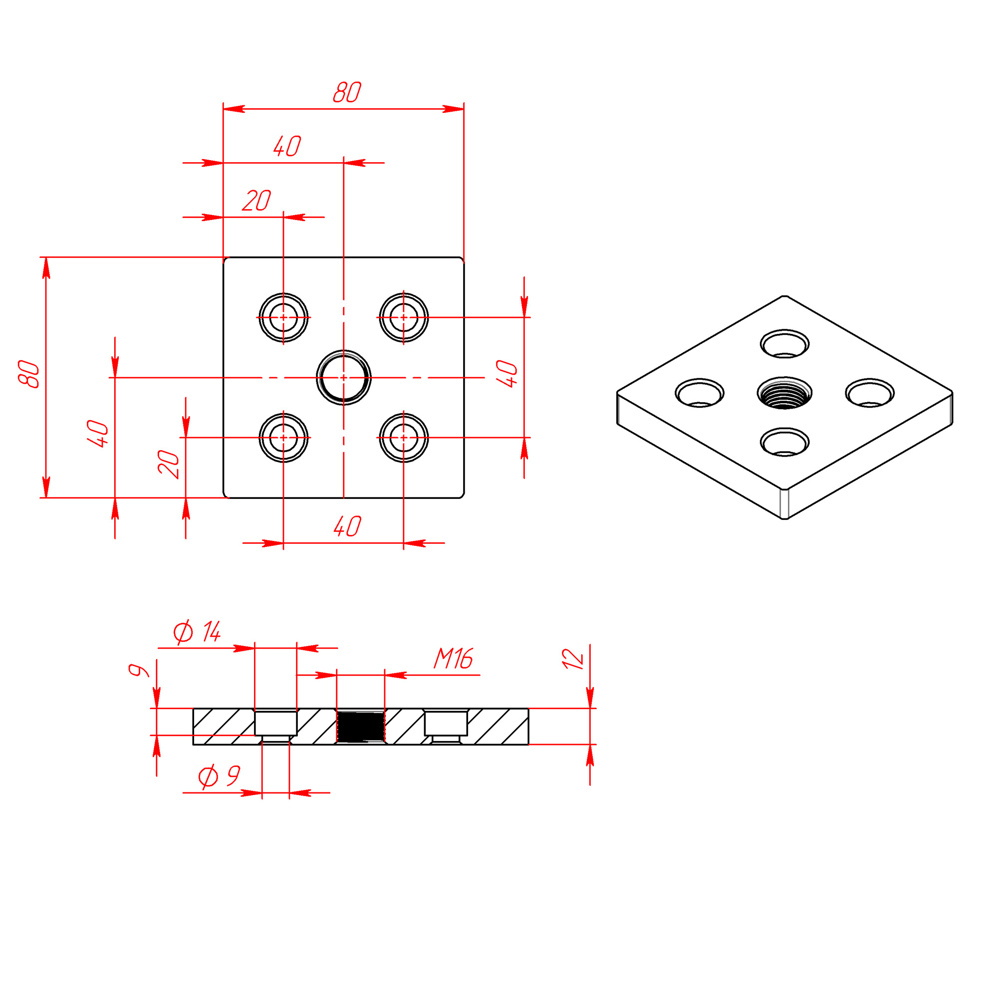 Опорная алюминиевая плита 80x80 мм с пазом 8 для установки регулируемой ножки M16