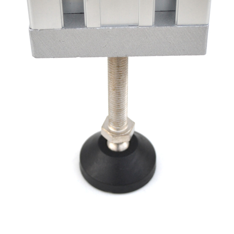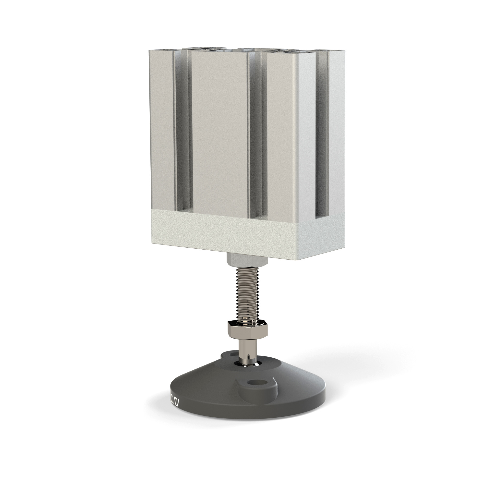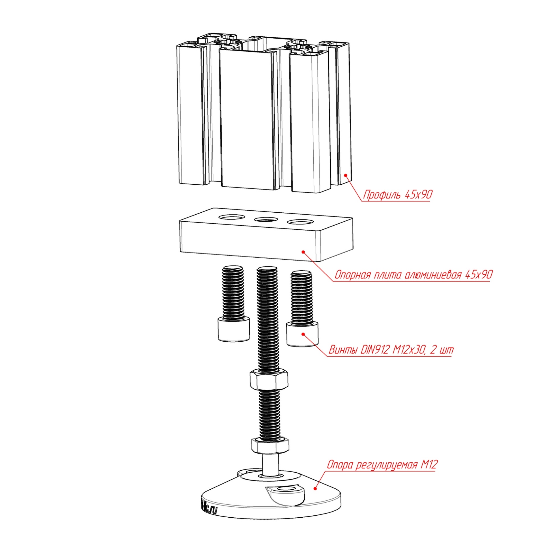 Элегантное и прочное решение для крепления ножек с резьбой M12 для установки и стабилизации конструкций из алюминиевых профилей 45х90 мм.