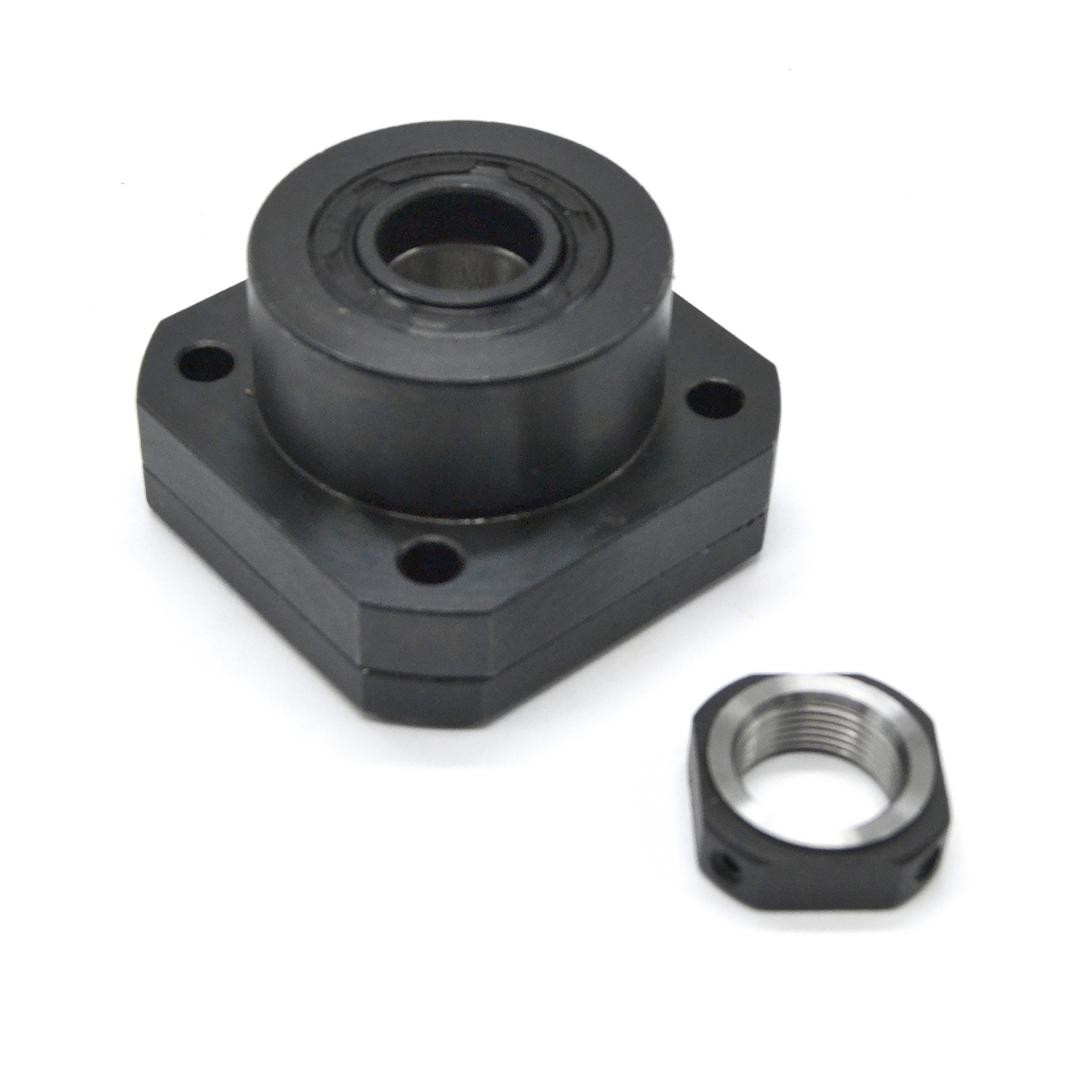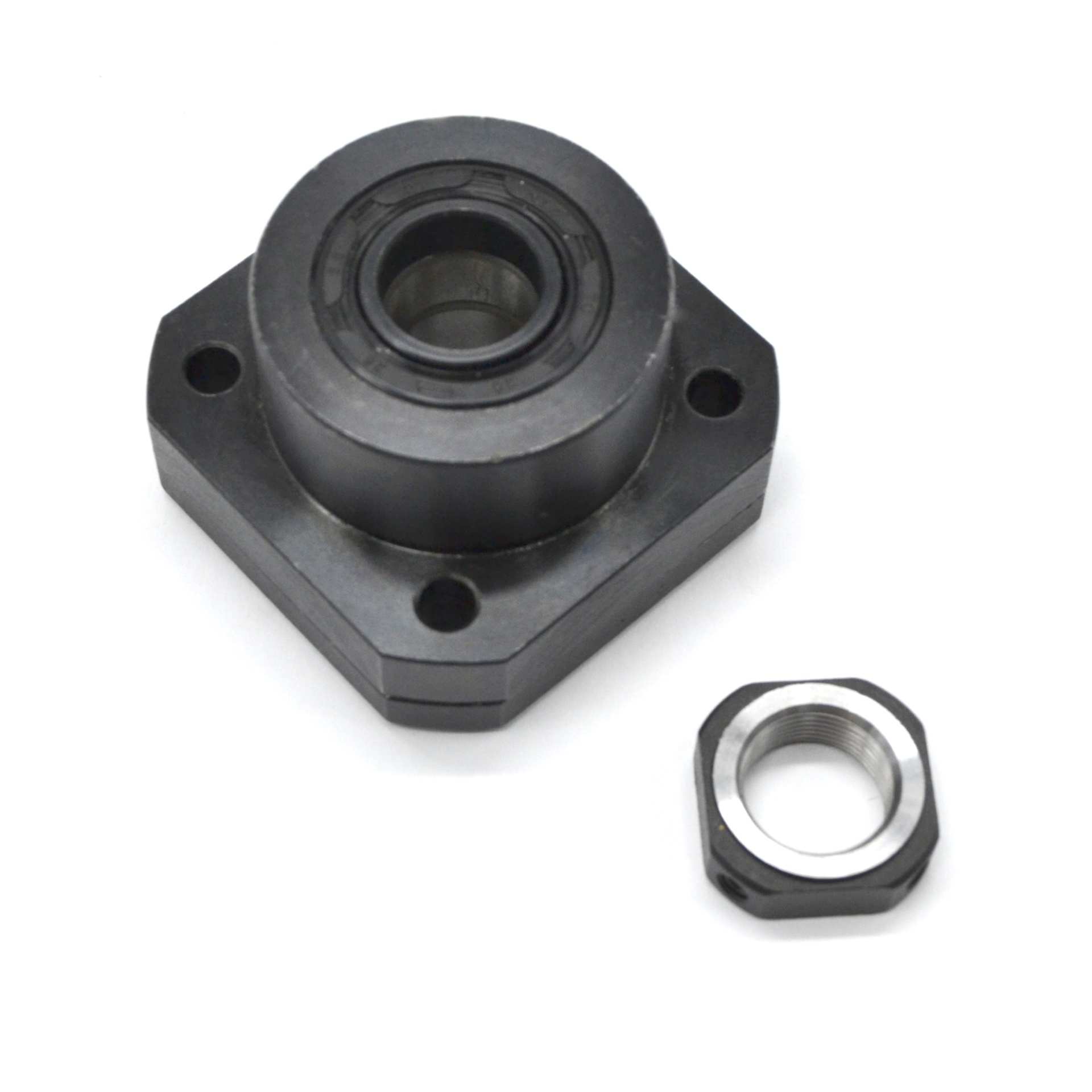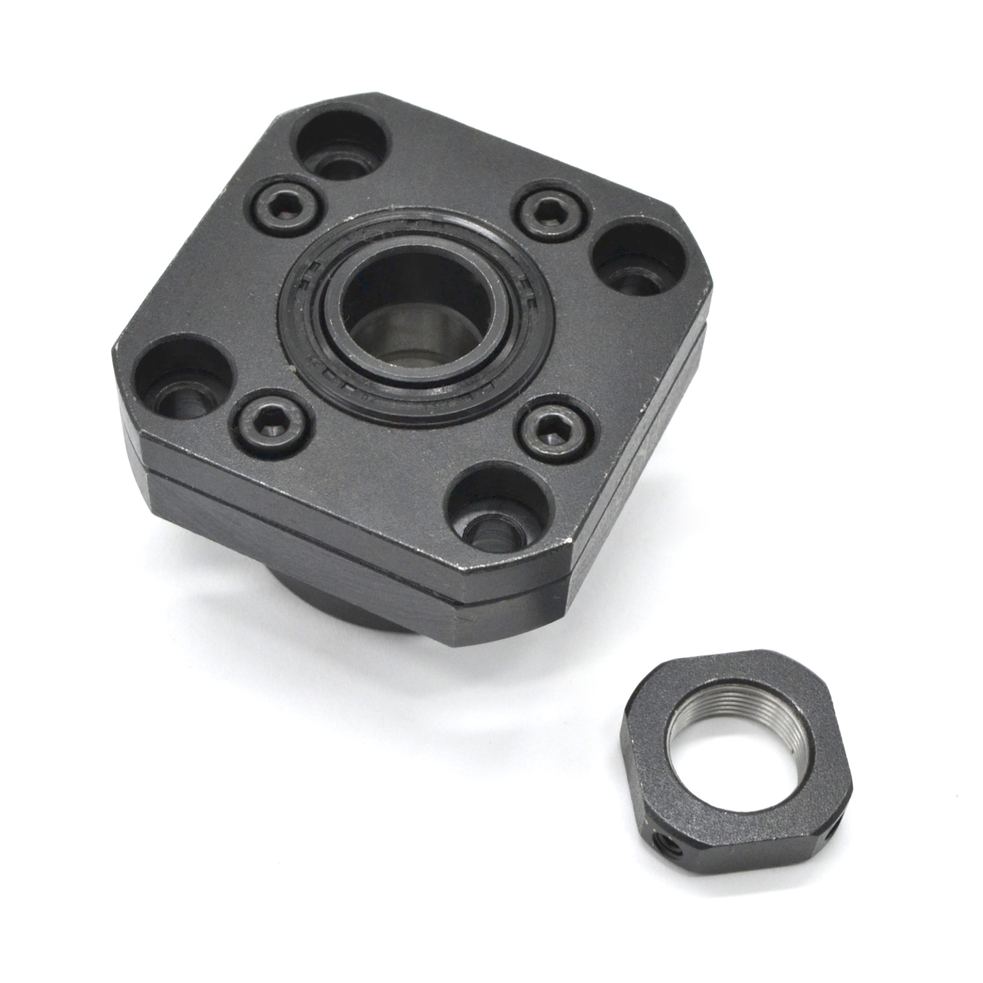 Опора фиксирующего типа для шарико-винтовых пар: фланец + стопорная гайка + внутренняя опора с двумя радиальными подшипниками. Обеспечивает жёсткую радиальную фиксацию винта ШВП и создание натяжения в осевом направлении.