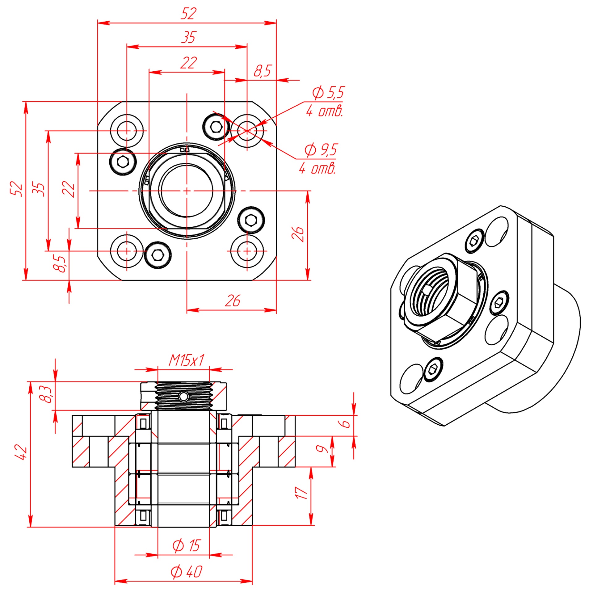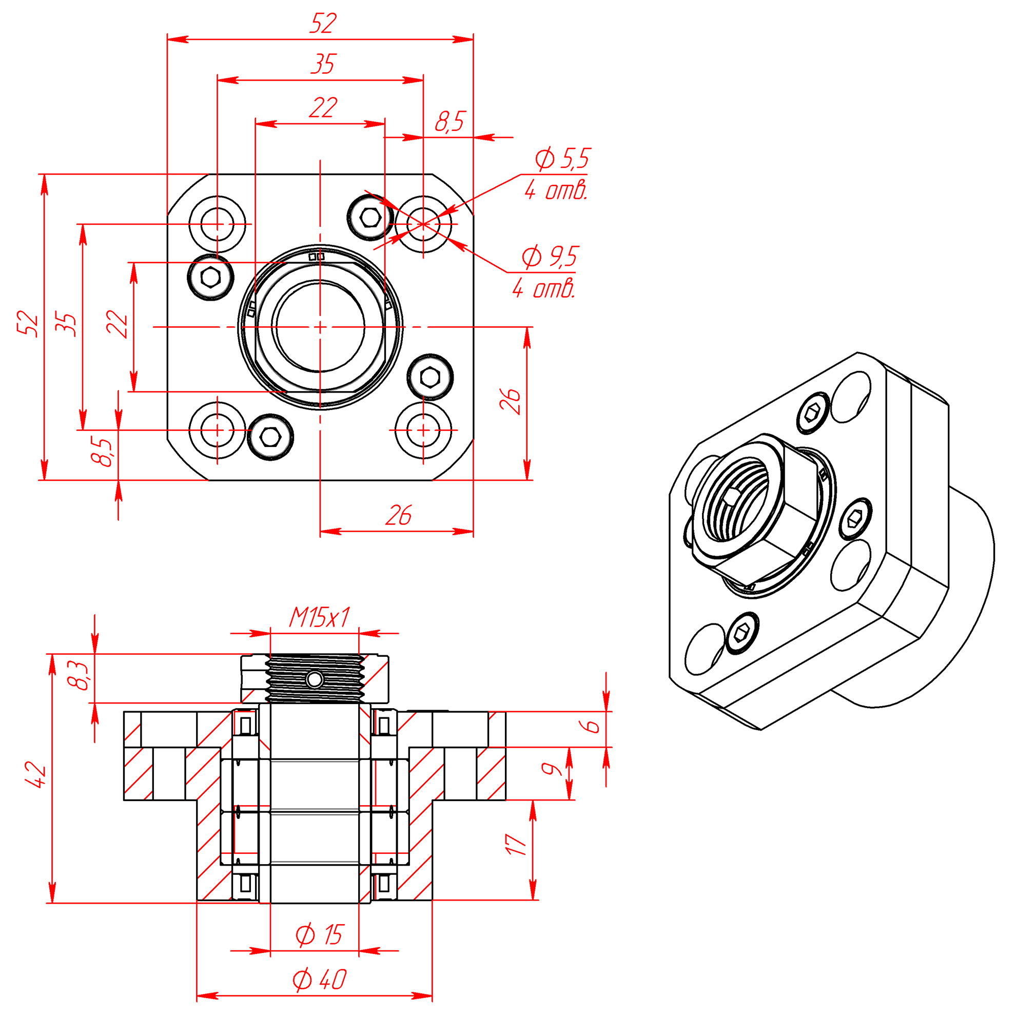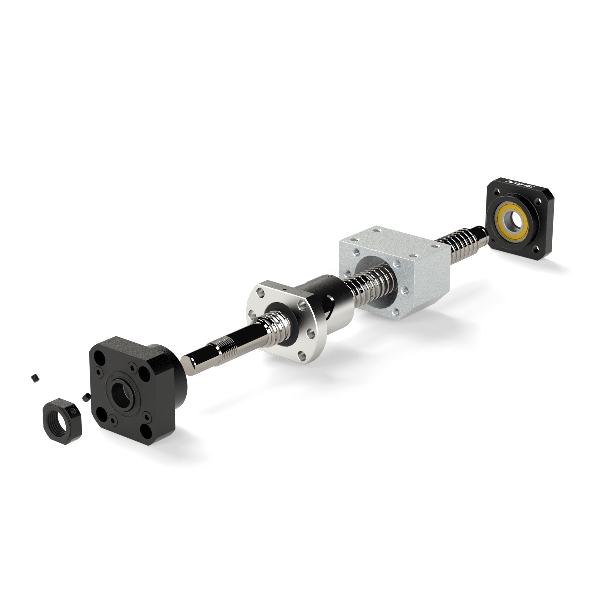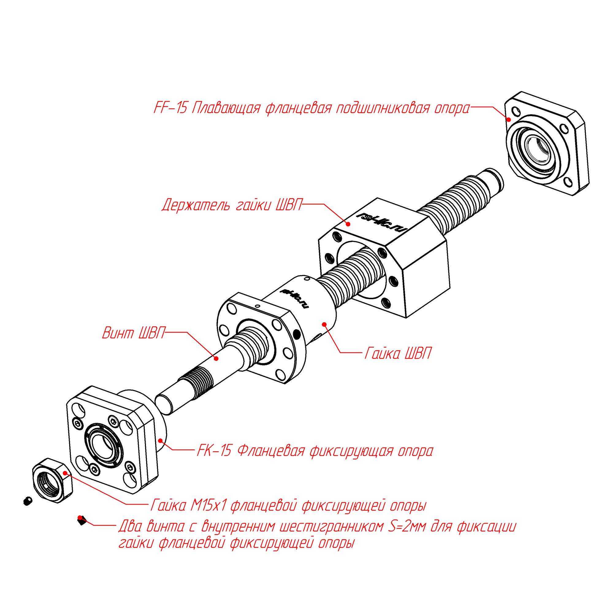 Опора фиксирующего типа для шарико-винтовых пар: фланец + стопорная гайка + внутренняя опора с двумя радиальными подшипниками. Обеспечивает жёсткую радиальную фиксацию винта ШВП и создание натяжения в осевом направлении.