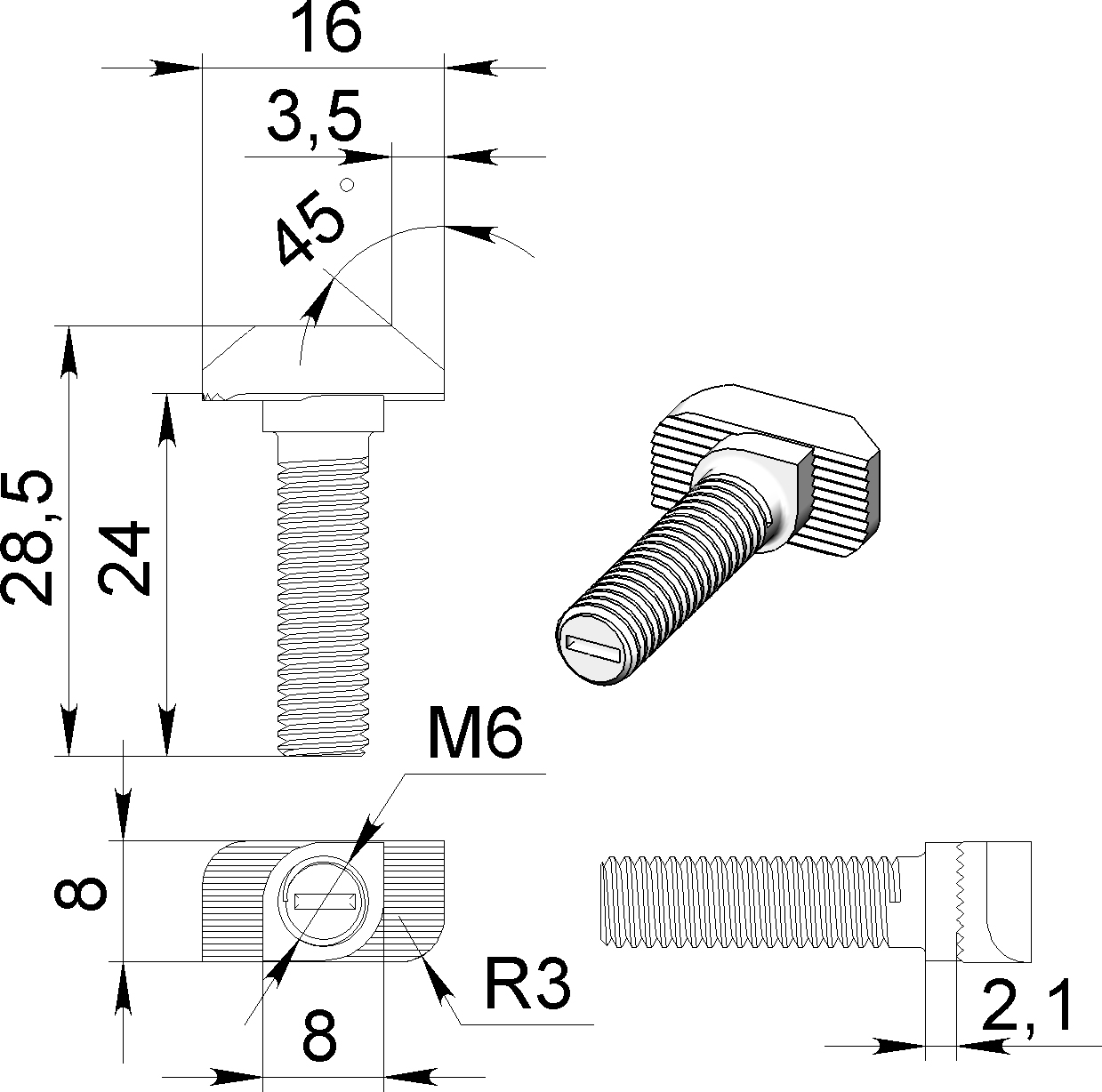 12001AL | Сухарь пазовый алюминиевый, паз 8, М3, серия 30