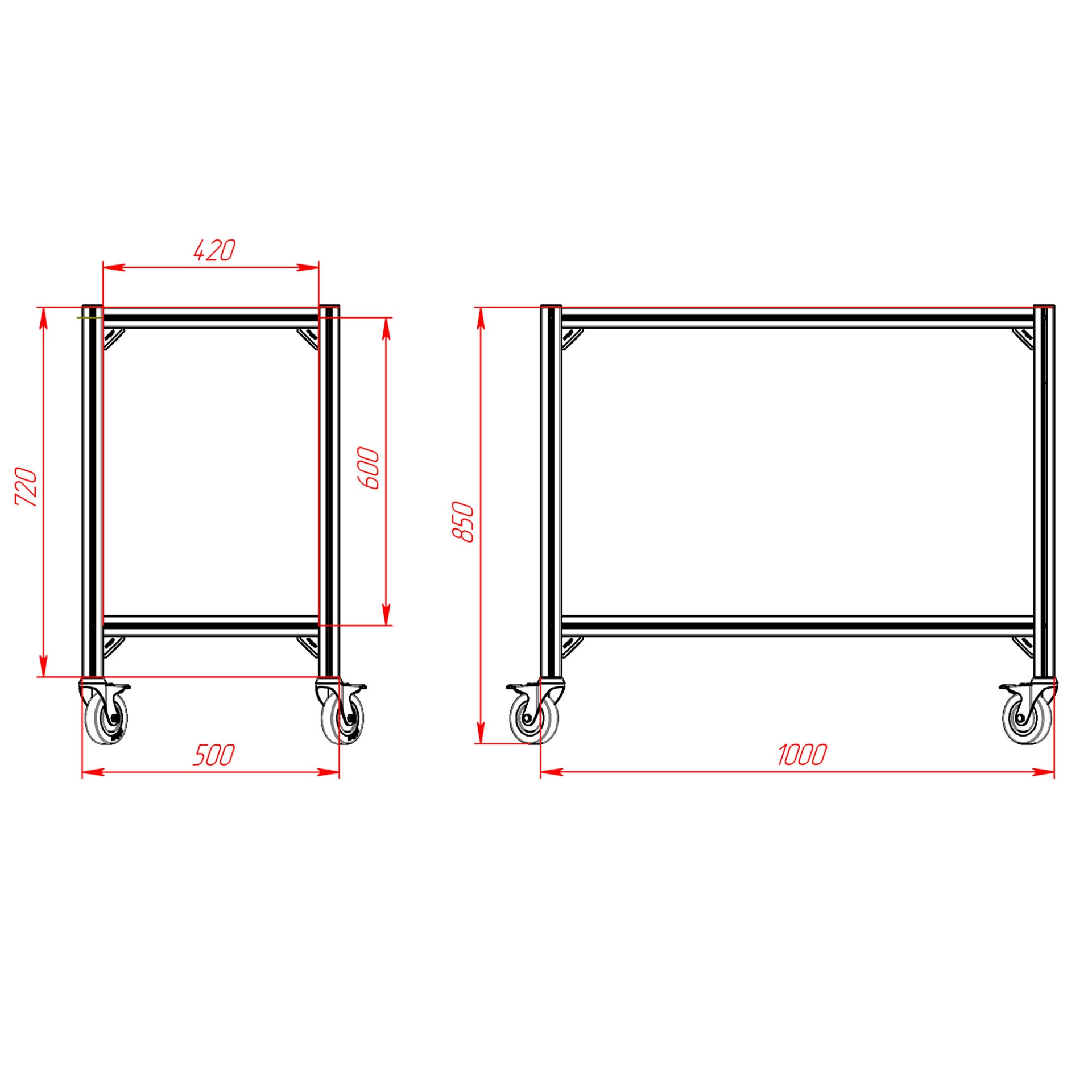 Стойка подкатная RSI-1008-500х1000х850-2 представляет собой прочную и мобильную конструкцию, выполненную из легкого и прочного алюминиевого профиля. Оснащена двумя металлическими полками толщиной 2 мм, что обеспечивает надежную поддержку грузов. Четыре поворотных колеса с тормозами гарантируют удобство перемещения и устойчивость в рабочем положении.