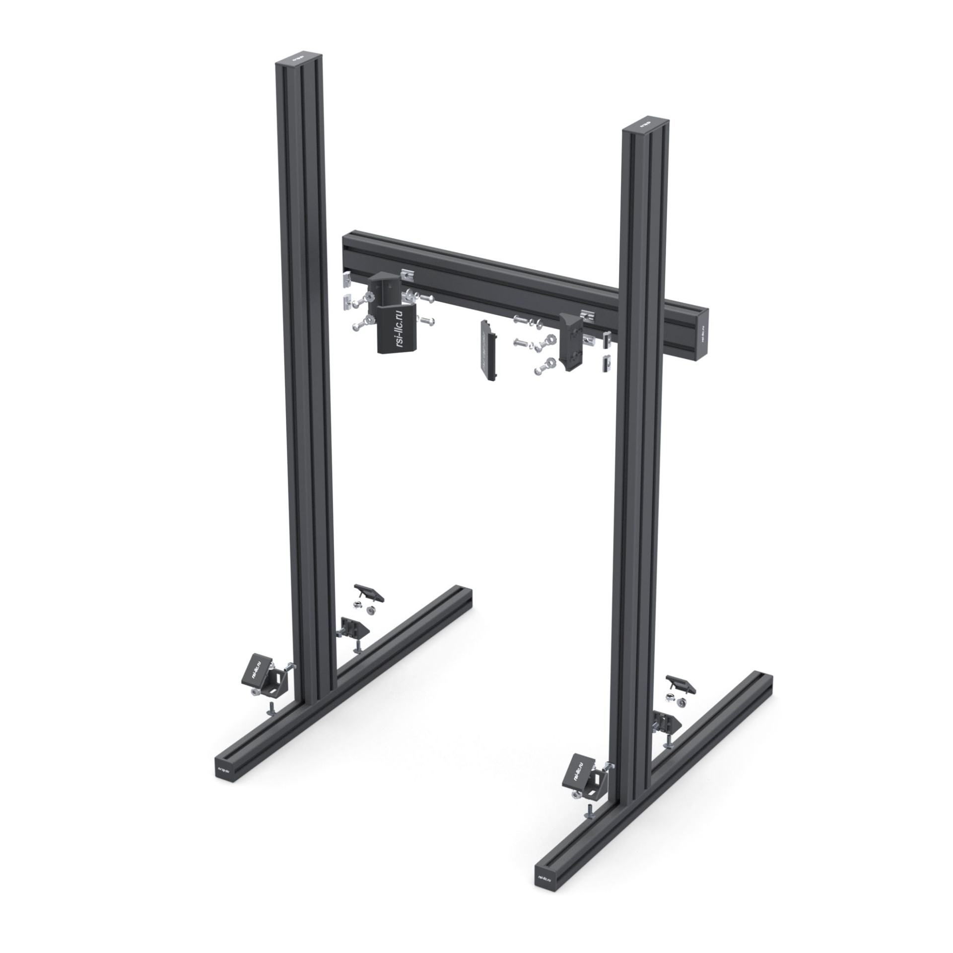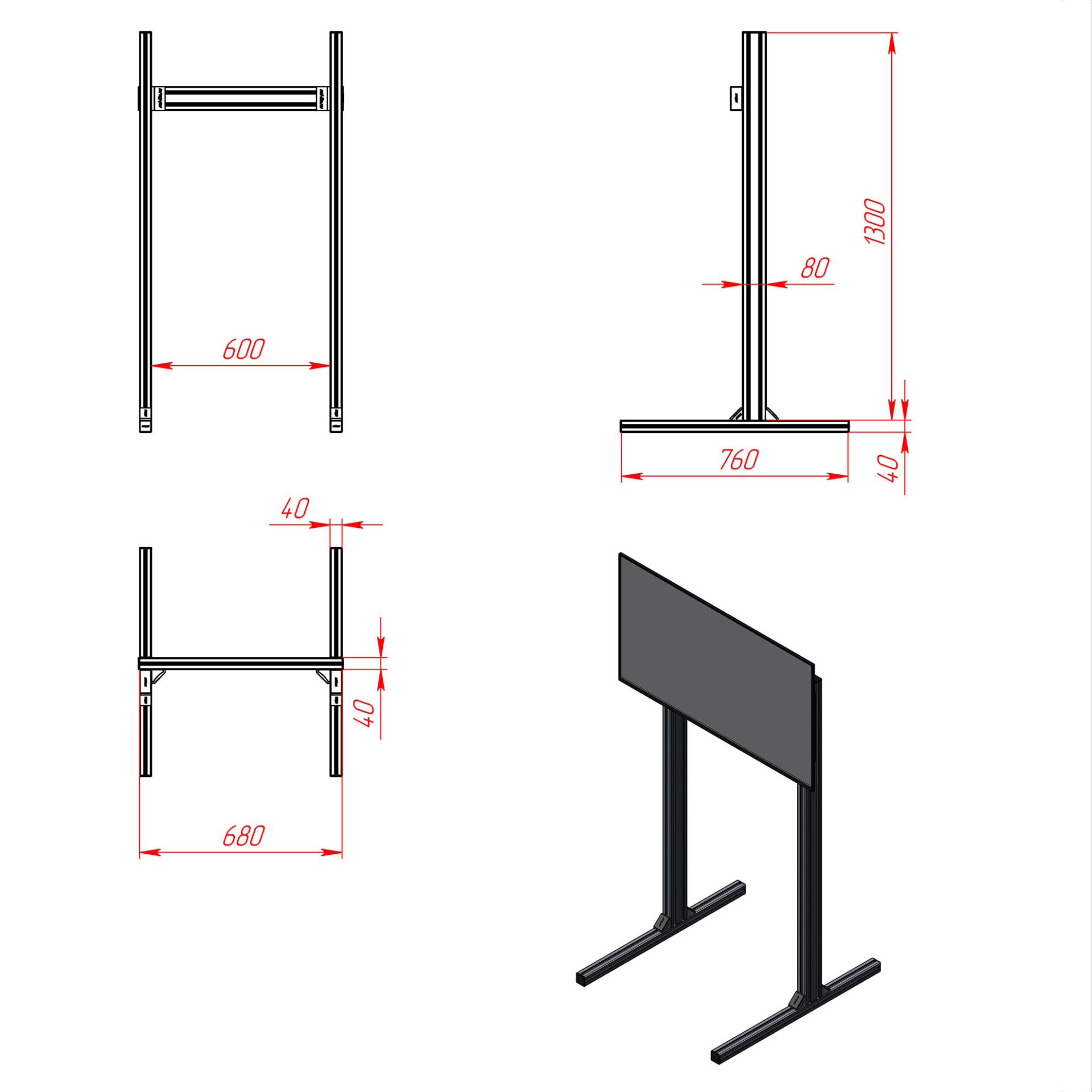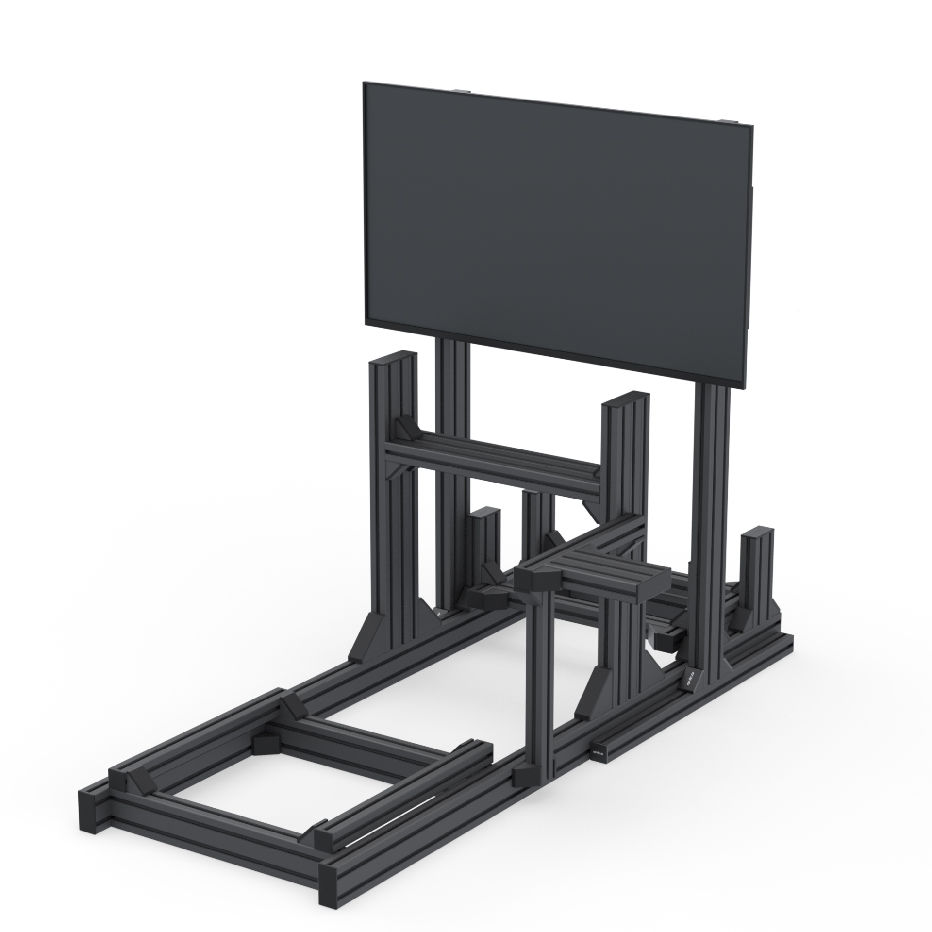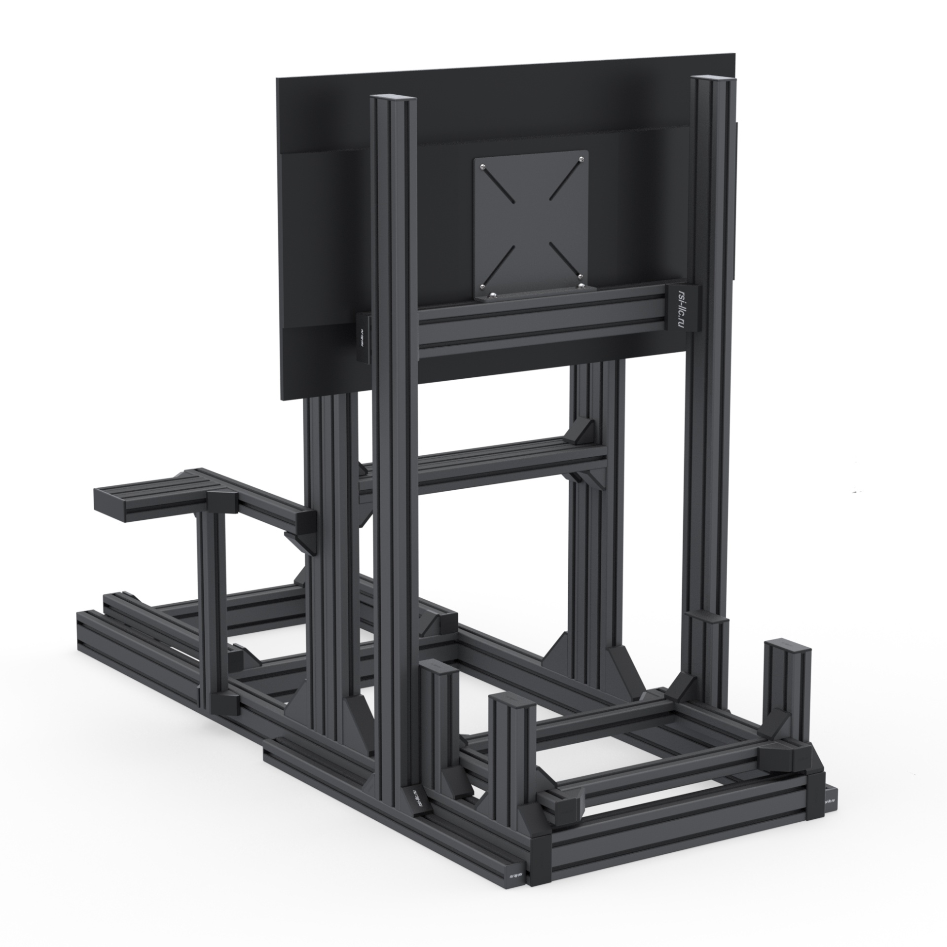 Лёгкий, жёсткий и аккуратный сингл-скрин из анодированных алюминиевых профилей (серия 40×40 и 80×40, паз 8 мм), чёрное порошковое покрытие. Предназначен для самостоятельной сборки и интеграции с кокпитами RSI. Поддерживает мониторы до 42".