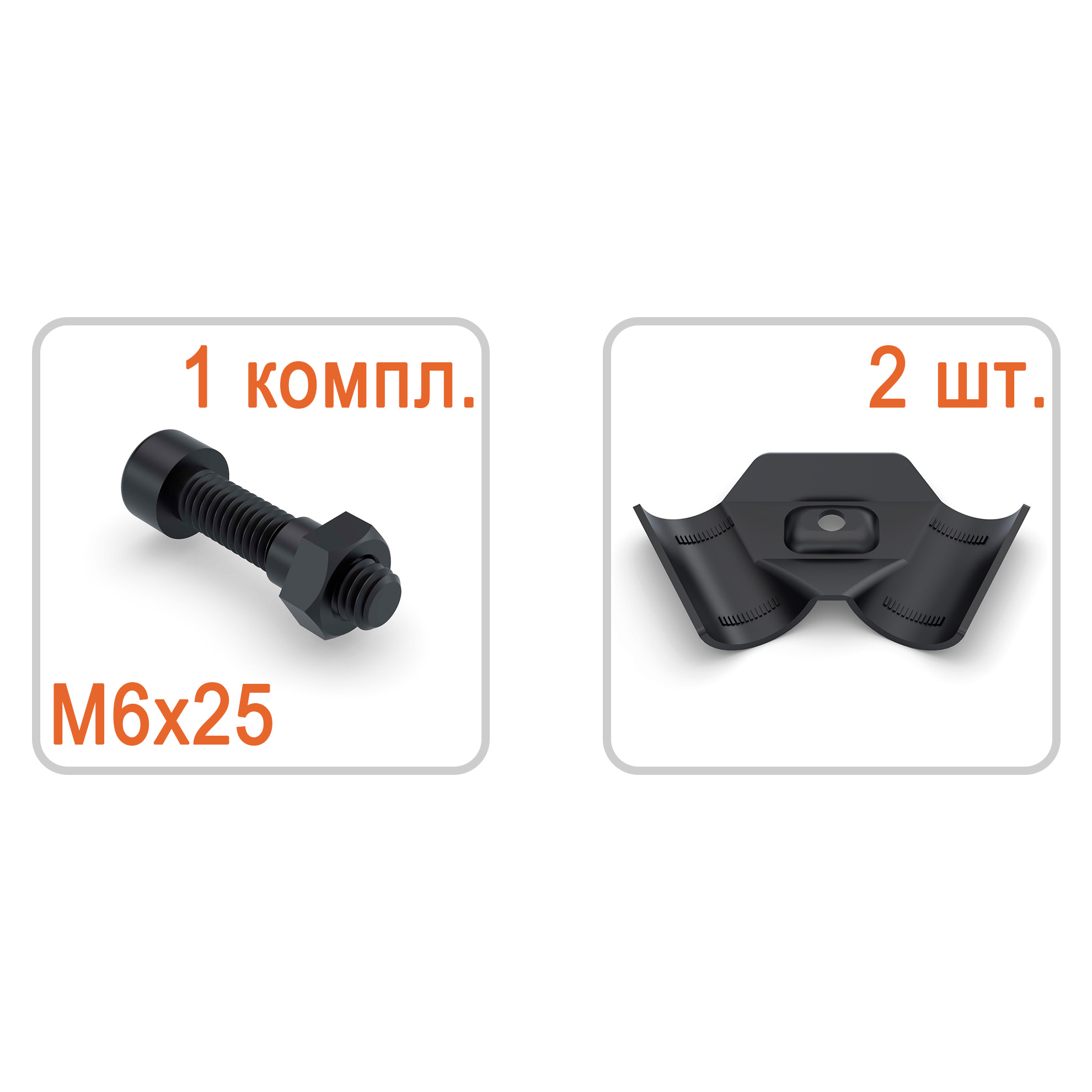 Стандартно комплектуется одним винтом под внутренний шестигранник и одной гайкой.