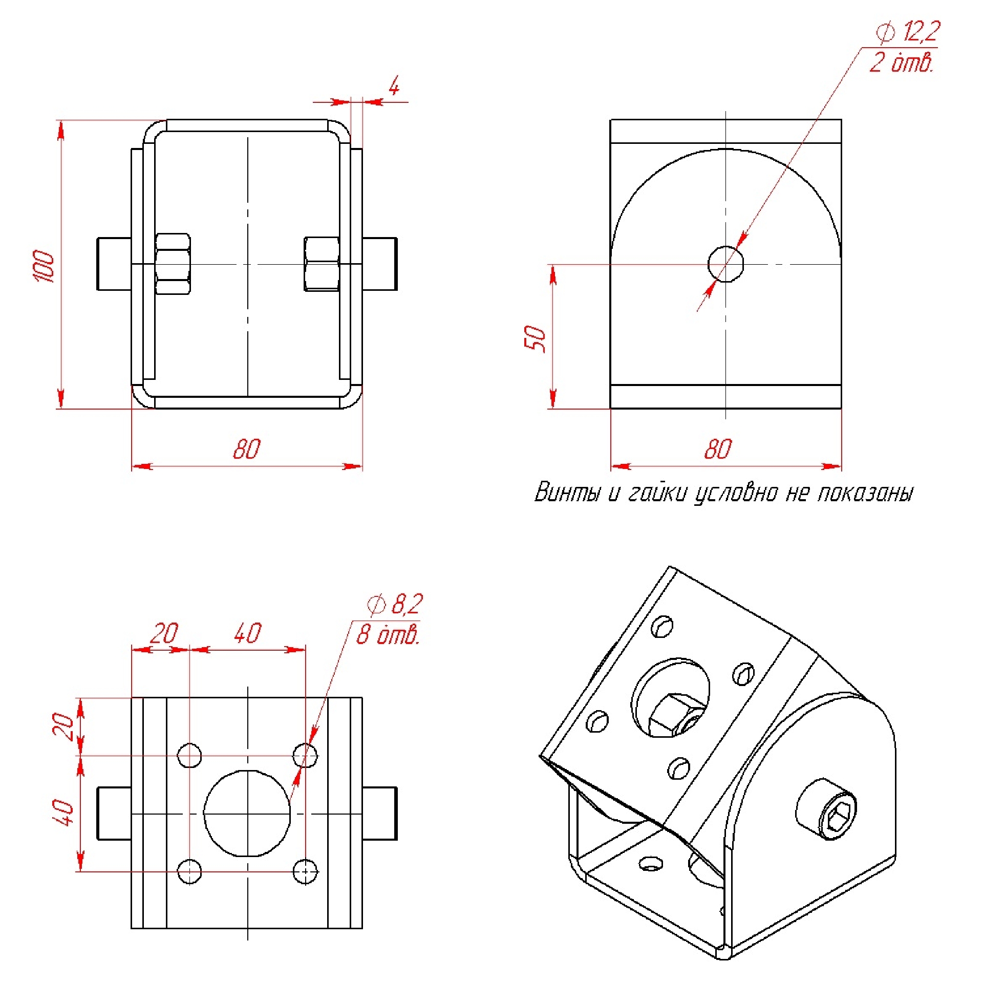 Предназначен для жесткого или подвижного соединения профилей 80х80 мм с пазом 8 мм под любым углом в пределах 180° Изготовлен из листовой стали толщиной 4 мм.