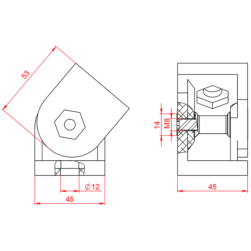 Шарнирные соединения артикул 2051 предназначены для жесткого или подвижного соединения профилей 45х45 под любым углом в пределах 180°.